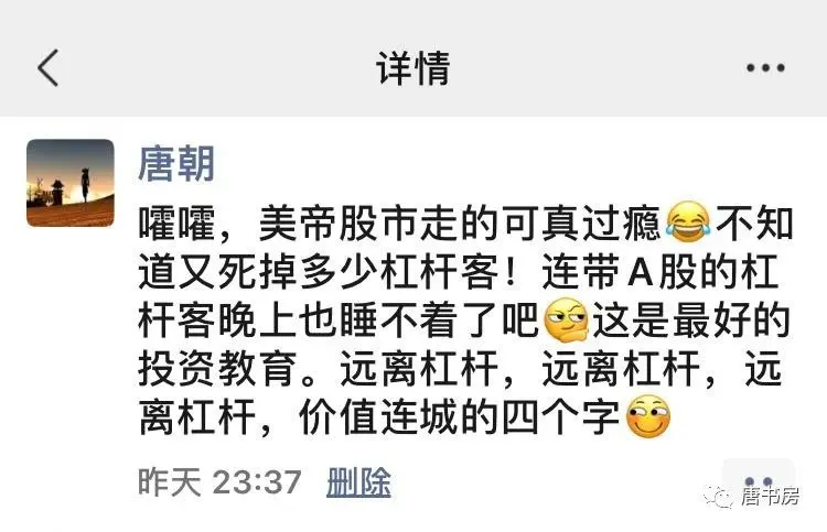 一定要学会“看别人吃一堑,让自己长一智”,有些东西没有必要非要自己亲自交学费,老唐这个傻蛋儿已经代表你交过了此时,全球恐慌性暴跌中,真正受损的只有三种钱,杠杆钱、别人的钱、短期必用的钱。