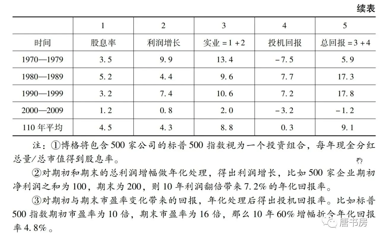 下面这张表是博格分享的美国股市从1900年到2009年110年时间里的回报来源