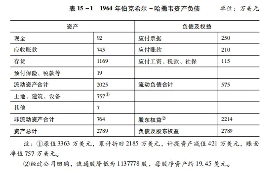 巴菲特入主第一年,从公司挤出526万美元的现金(其中250万美元用于归还债务),公司还有账面值1690万美元的存货和固定资产,以及742万美元应收账款。