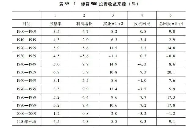 随着时间的推移,博格不断更新这个研究数据。表39-1是博格提供的1900—2009年110年跨度的研究结果。