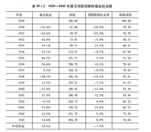 凯恩斯管理国王学院切斯特基金的业绩,准确地记录了转型结果。1929年之后的业绩情况如表39-2。