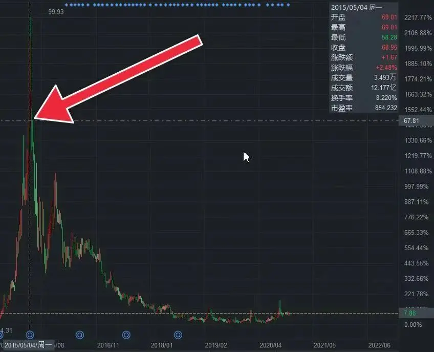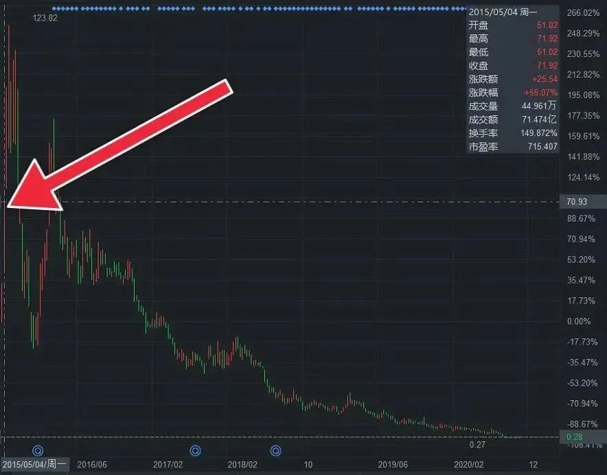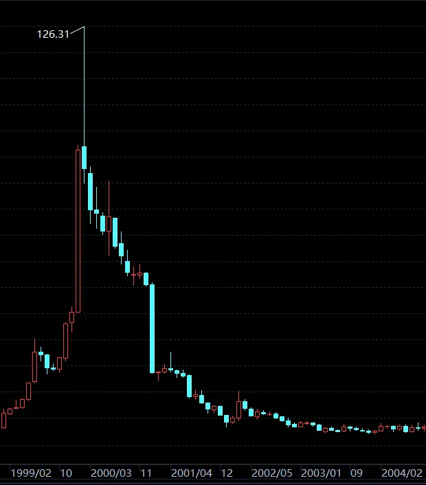 但那又怎样?照样又涨了约100%,然后才跌,至今跌掉99.77%。