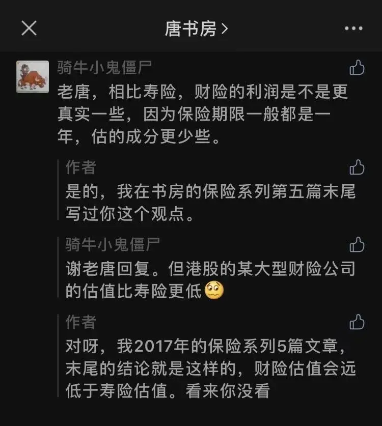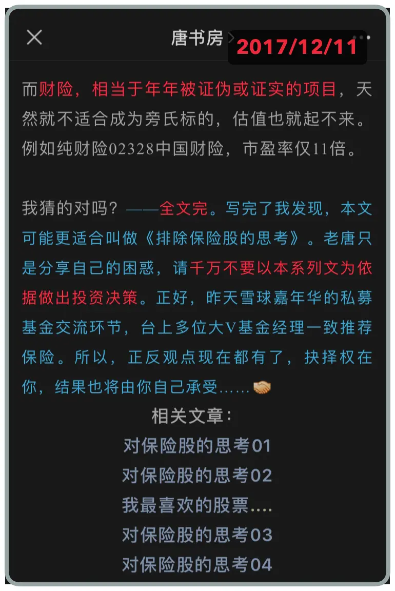 我给他推荐了2017年12月的“对保险股的思考”系列5篇。
