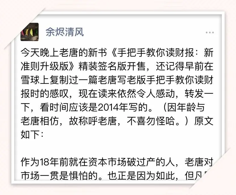 所以,老唐说《手把手教你读财报:新准则升级版》是必买必读书籍的时候,建议你相信我今天早上,书房有位叫@余烬清风 的朋友,捞起了老唐自己都不记得的一份老帖。