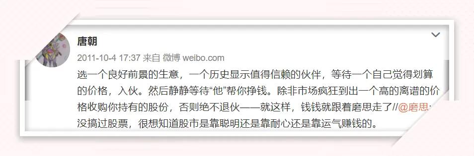 因为投资的理念真是很简单的。刚好前段时间有朋友去刨老唐早期的微博,里面有段大约十年前,老唐和朋友谈论投资应该怎么做的话题
