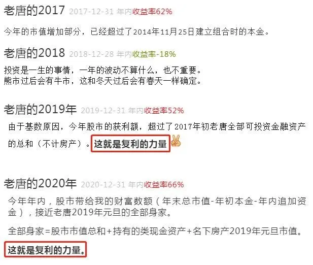 而过去两年,老唐陆续往实盘里增加了部分资金,因此总的收益金额约等于2019年初个人全部身家。这就是复利的力量。