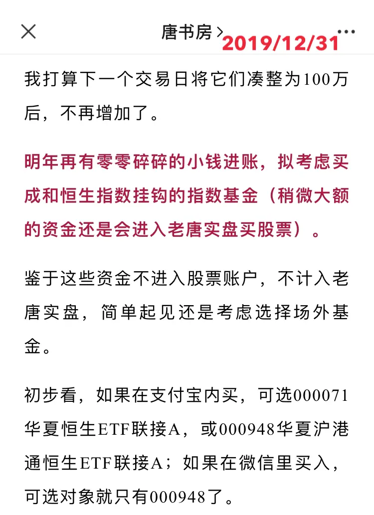 在《老唐的2019年》一文里,已经介绍了老唐的两只医药基金,以及2020年的零散资金准备买入恒生指数基金。