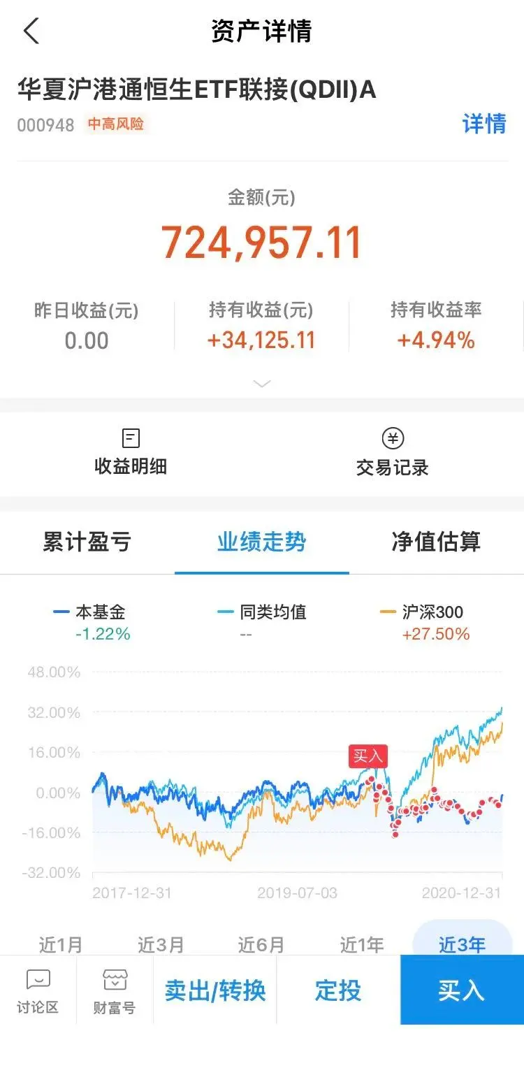 年内零碎资金,均买入了000948恒生指数基金。目前持有情况如下: