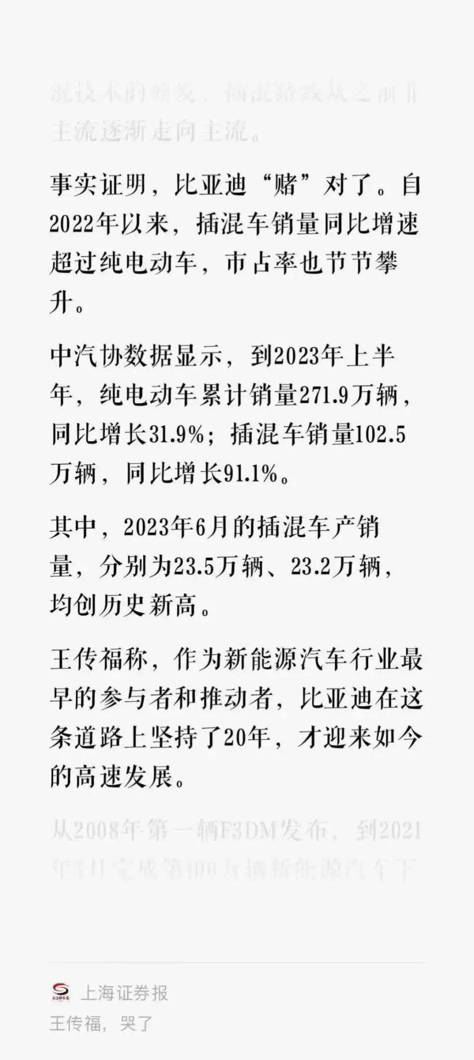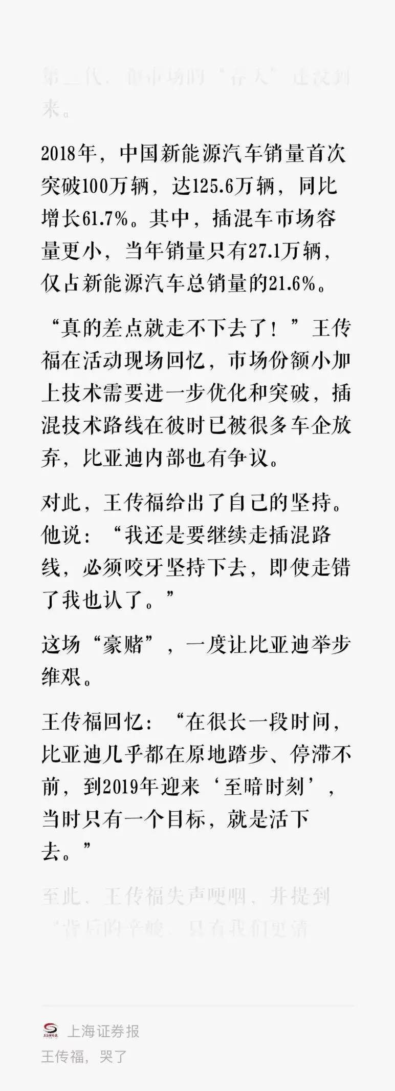 正巧,早上收到上海证券报的一篇推文,谈比亚迪王传福的。文中有这样两段话,谈到比亚迪豪赌混动,从2008年到2019年毫无起色,挣扎在生死边缘。