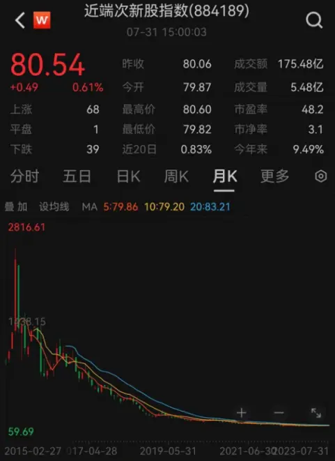 邓聪:唐师说的一点没错,来看看近端次新股指数,那可真是“飞流直下三千尺”呀,从15年最高2566,到现在80,跌幅97%,我滴个乖乖。