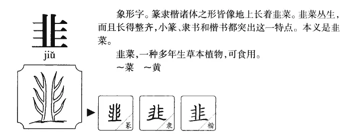 “韭”这个字,是个象形字,下面一横是地面,上面是随风飘摇的茎和叶。茎和叶,构成一个清晰的汉字:非。