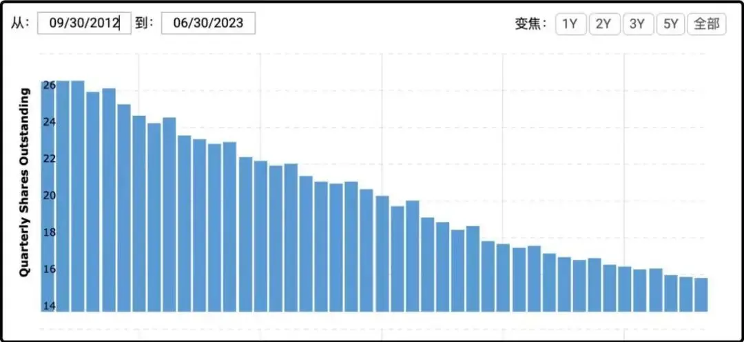 武侃:放上苹果从2012年到2023年的历年流通股总量(季度柱状图)。