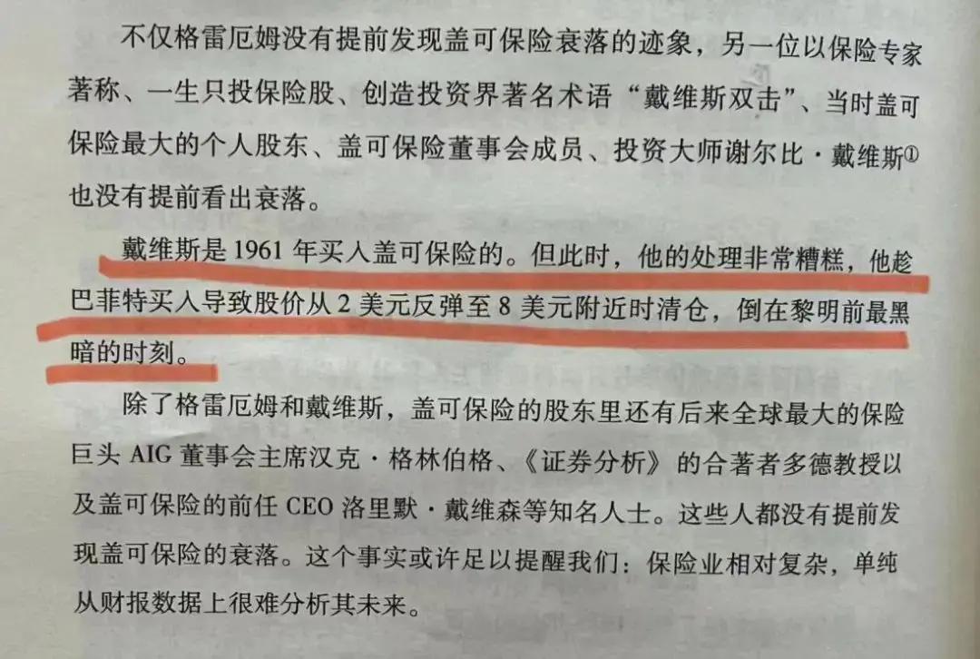 这里的爷爷,就是我们经常说『戴维斯双击、戴维斯双杀』术语的发明人谢尔比·戴维斯,是戴维斯家族的一代目。曾在《巴芒演义》里短暂登场,作为巴菲特在GEICO即将破产之时的逆行者离场的,见截图。