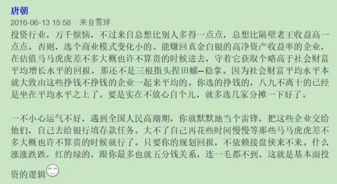 1.道尽投资的底层逻辑:选个商业模式变化小的,能赚回来真金白银的高净资产收益率的企业,最终的收益会处于平均之上。