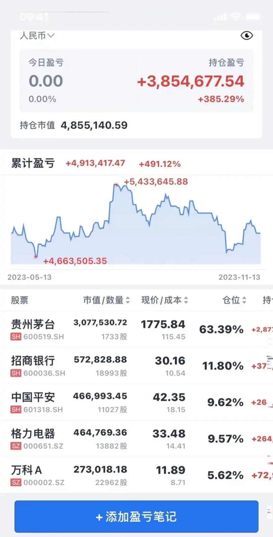 组合累计赚了491.34万,即当前账户共计591.34万,其中持股总市值485.51万元,期间现金分红然后闲置在账户上的钱一共105.83万。