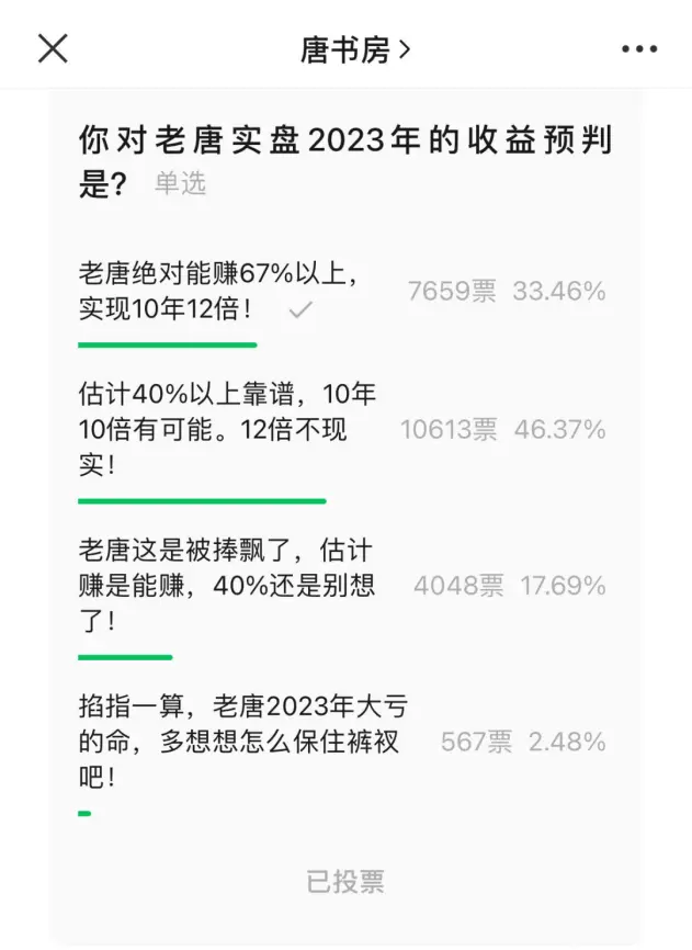 在2022年12月31日的周记里,我搞过一个投票,请大家猜老唐实盘2023年的收益情况。