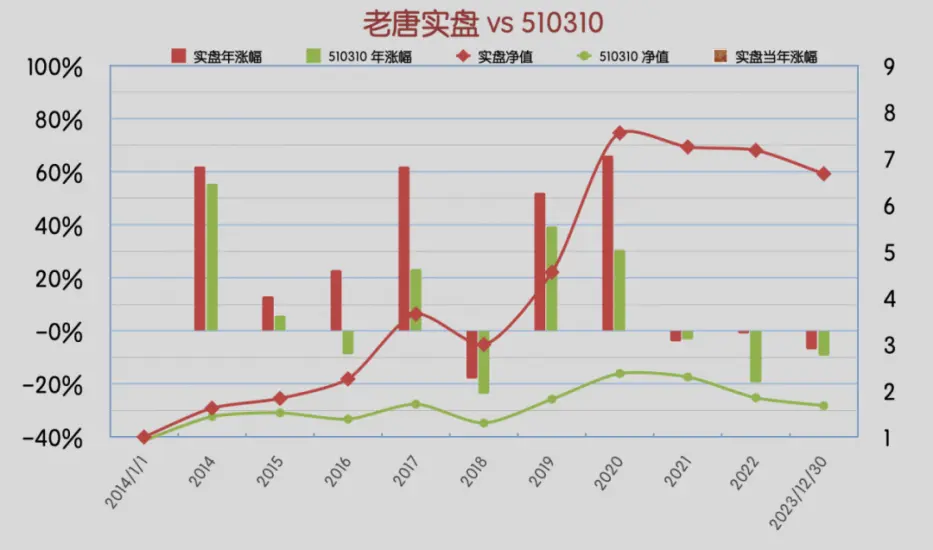 注:老唐实盘净值变化,取基金净值收益率和资金加权收益率二者中的较低值,但2023年因为没有资金进出,所以两个值是一样的。