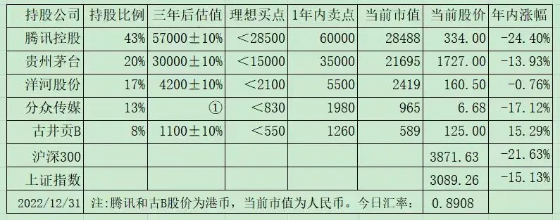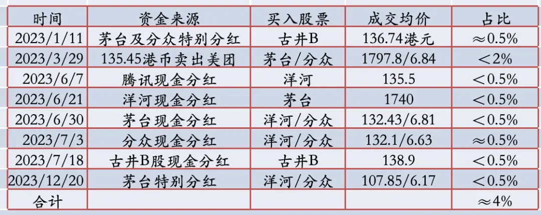 这一年,实盘没有新增一分钱资金。除卖出腾讯所送美团之外,也没有其他任何卖出。全年买入总量约为实盘总值的4%,资金均来自持股企业分红。
