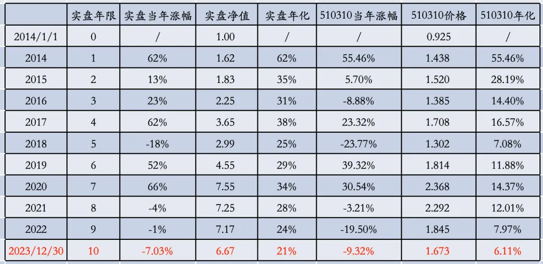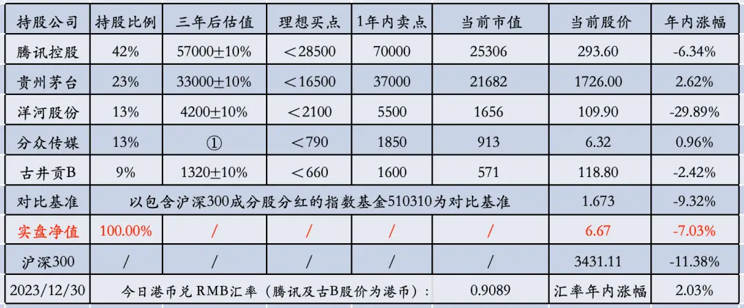 2023年,沪深300指数从3871.63点下跌至3431.11点收盘,下跌11.38%。老唐实盘持股最终变成下表,年内收益-7.03%。