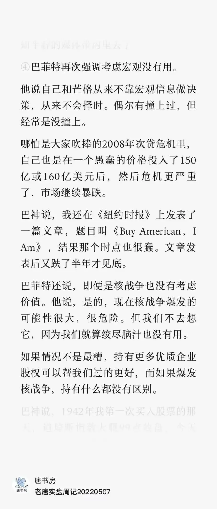 在书房旧文《老唐实盘周记2022/05/07》一文里,我曾经分享过巴菲特在当年的股东大会上“再次强调考虑宏观没有用”的观点。
