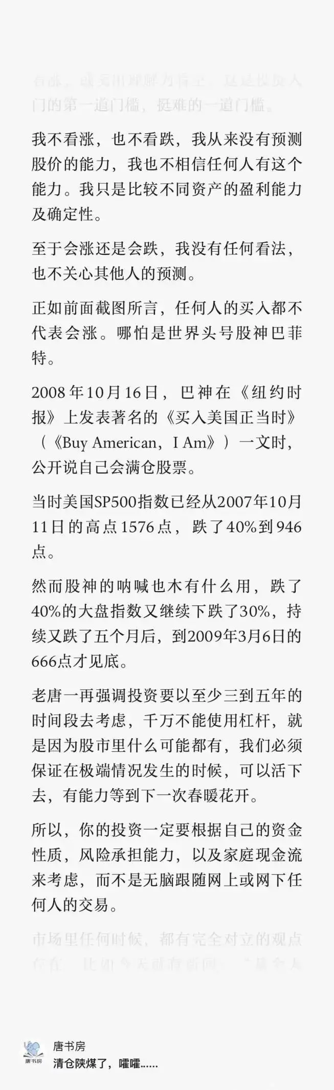 唐朝:是的,大起大落,就是理性投资人的机会,差异只是全部便宜里占到了多少。很多人不满足十份便宜里只占到了四份,结果又因此而变成了市场先生的木偶。