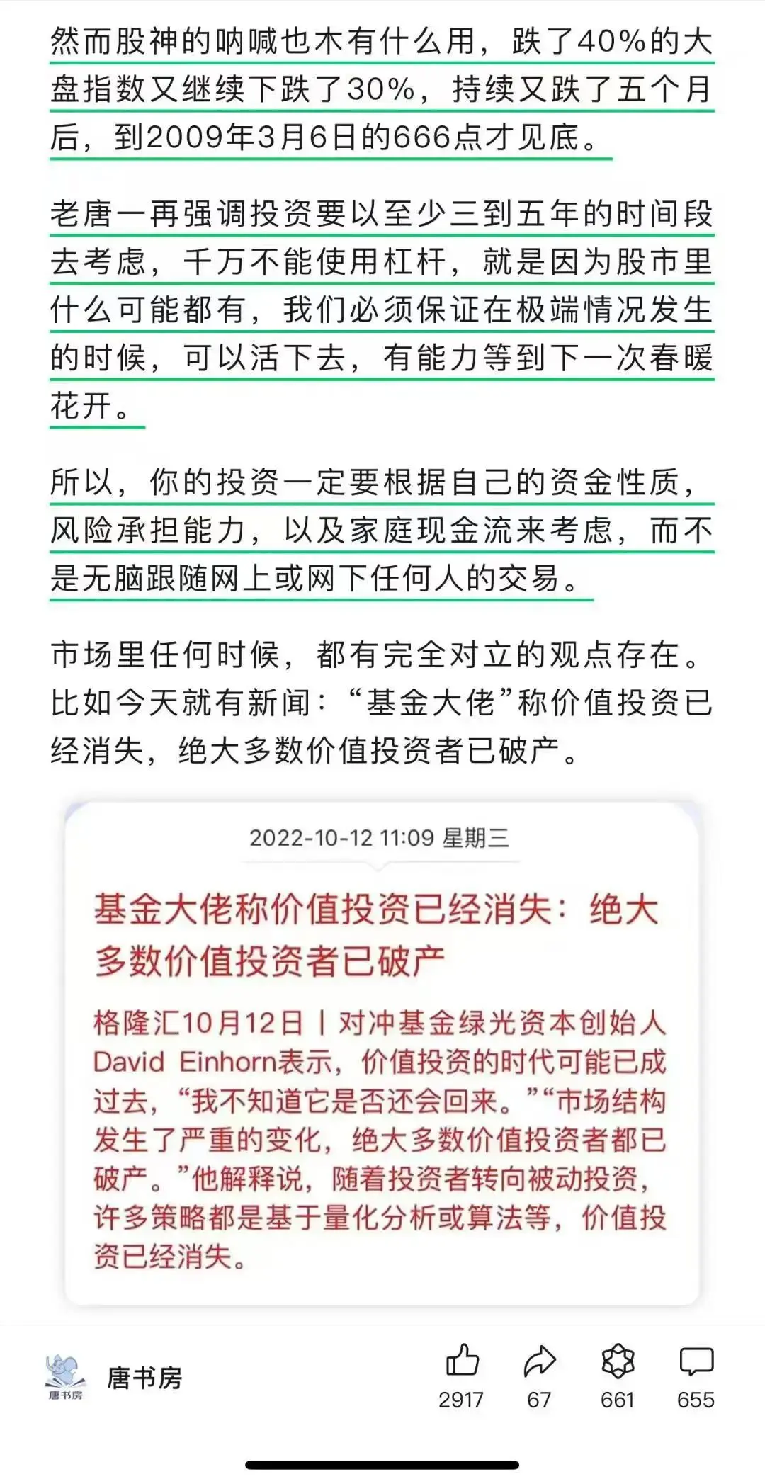 说起预测,很巧,就在前面提到的那篇《清仓陕煤了,嚯嚯……》里,我还遇到了这两天正在看的一本书《空头之王》的作者、绿光资本的创始人大卫·埃因霍恩,在2022年10月12日当天的言论:“价值投资已经消失,绝大多数价值投资者已破产”。