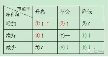 为了忽略公司股本送配等因素的干扰,可以将上面的公式前后都乘以总股本,变成总量概念,即:公司市值=市盈率×净利润。由这个公式,我们得知,股价(公司市值)变化有两个源头,一个是市盈率的变化,一个是净利润的变化。如果将这两个因素的组合,可得矩阵如下:
