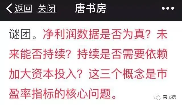 早在去年六月的一篇书房文章里,老唐写过了利用最简单的市盈率完成估值的三大核心因素:“净利润数据是否为真?未来能否持续?持续是否需要依赖加大资本投入?”