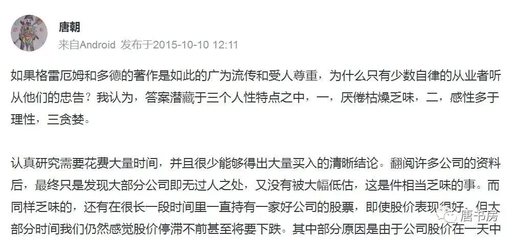 由此,老唐个人有个习惯,喜欢在网络上关注那些持续数月乃至数年盯着某一个行业甚至某一个公司的投资者,而不是什么都能谈的头头是道的人。