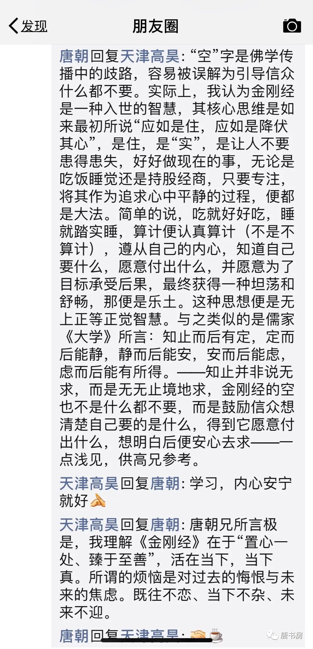 后记:很巧,今天早晨有位朋友,在朋友圈里发了一篇关于金刚经解读的文章,老唐一时兴起,掺和进去闲聊了一段。很奇妙,主题和老唐现在写的文章主题类似。征求朋友同意后,也截图送给大家。