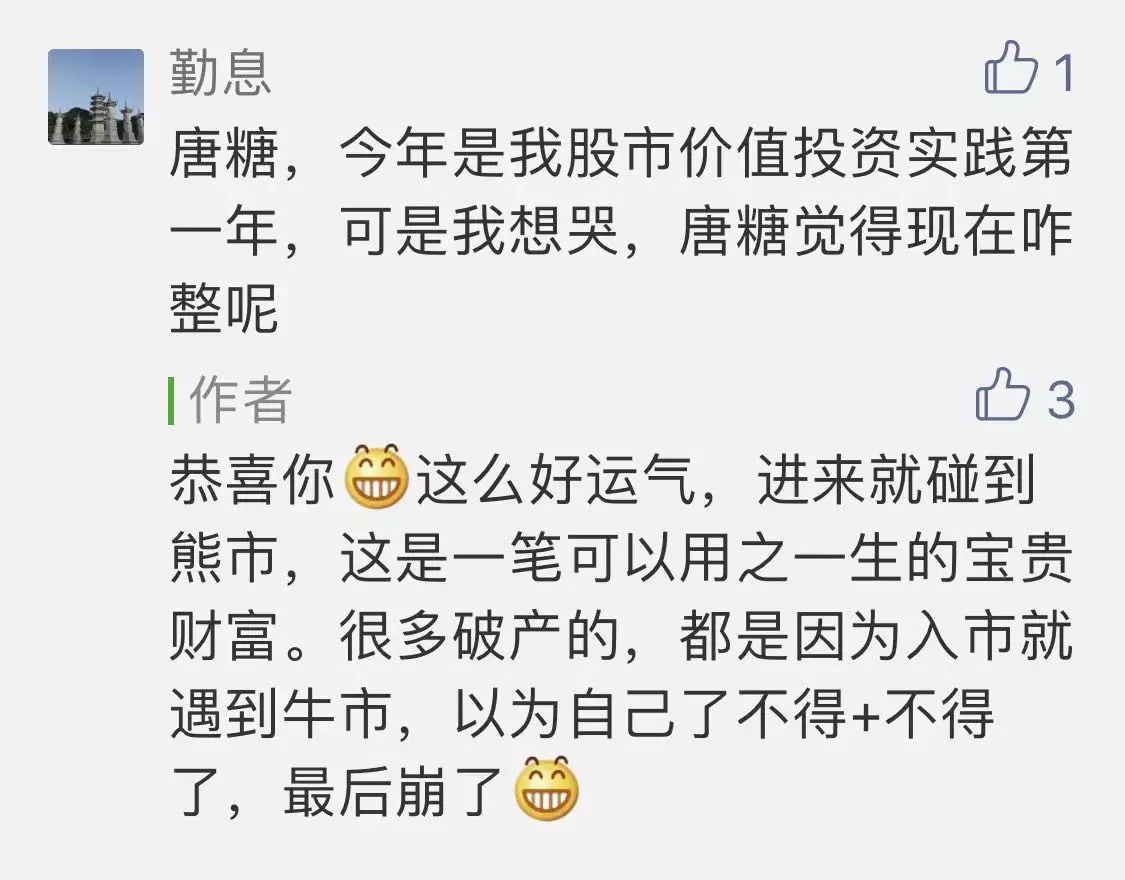 上篇文章,有位朋友留言说入市就遇到熊市,老唐回复恭喜你。