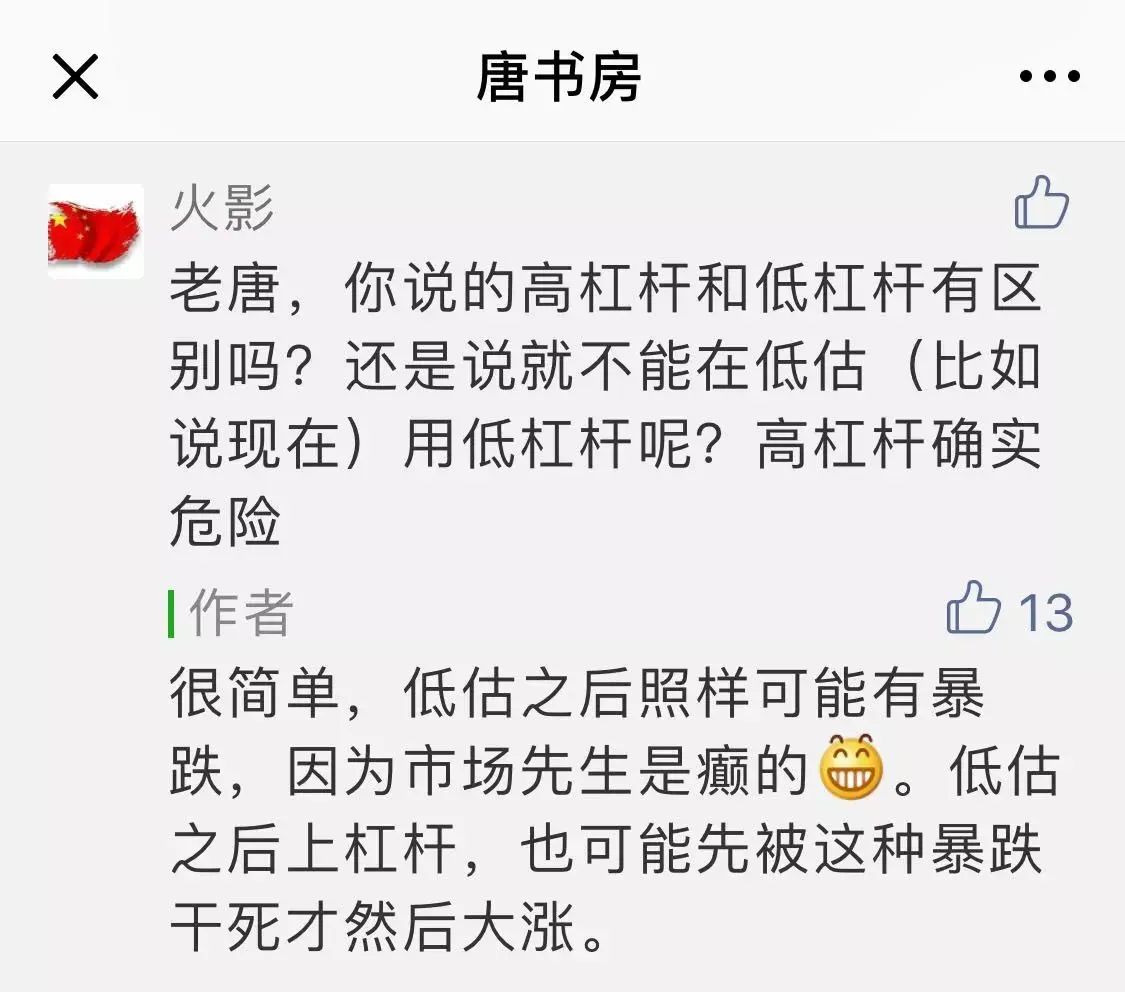 老唐答到“低估之后照样可能有暴跌,低估之后上杠杆同样可能先被暴跌干死然后才大涨”。这会儿看,当时顺口答的不完整。只回答了杠杆的问题,没有解决“低”杠杆问题。