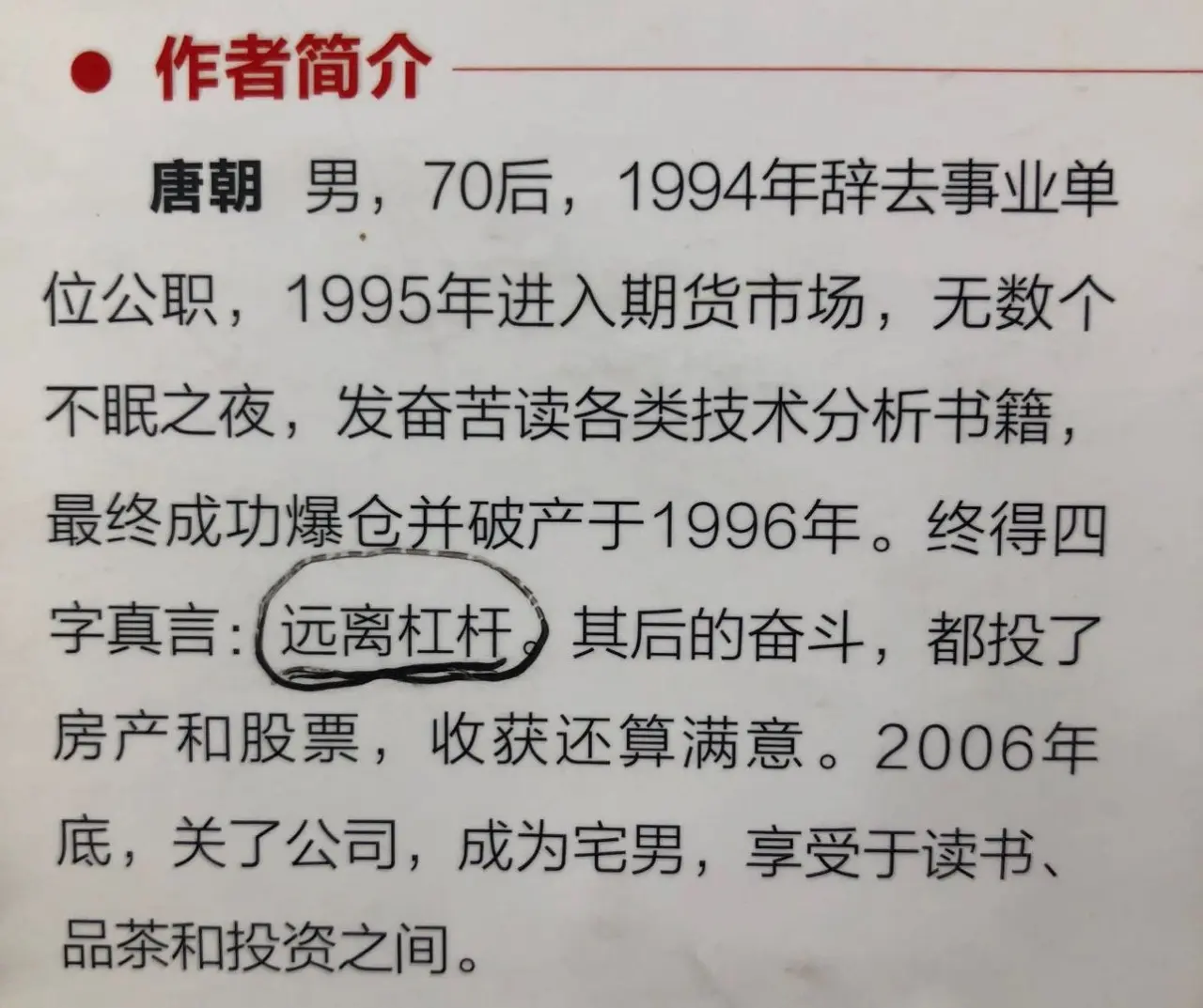 改变,从哪里来?真正核心的东西就两条:一个是不要将股票当做赌博筹码,不要寄希望于自己能掏别人腰包;一个是牢记市场短期波动不可预测,永远不碰杠杆。——记住这两点,你不可能不赚钱;反之,后面等待你的悲惨日子还多着呢!