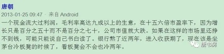 举个例子,早在2013-01-25日茅台大跌之日,老唐曾在雪球发帖说:“一个现金流大过利润,毛利率高达九成以上的生意,在十五六倍市盈率下,因为增长只是百分之五十而不是百分之七十,公司市值就大跌。如果在这样的市场里还挣不到钱,可能只能说自己书白读了。”(感谢书房读者@梓涵爹地 对老唐雪球帖的拷贝整理)