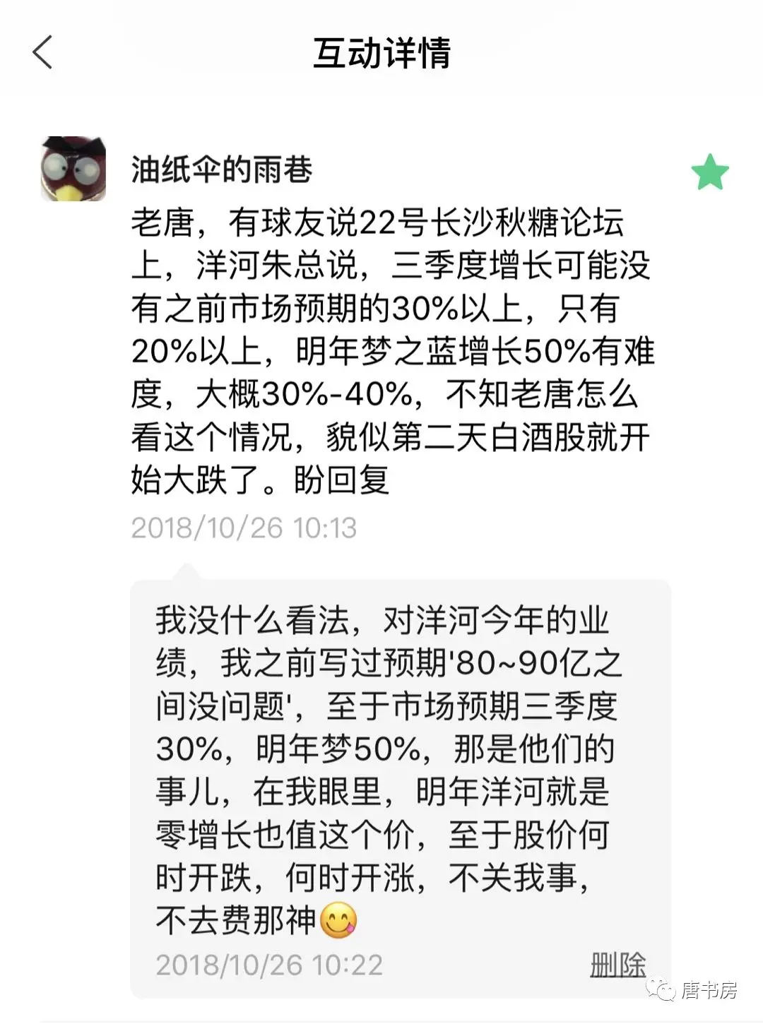 这又是一个“增长不会是30%,而可能是20%”引发的大跌。老唐再次重复“这么好的市场里赚不到钱,只能说书白读了”,但此时此景,有必要补上一句:但若因为公司经营好就期望股价只涨不跌,书没白读,但读给二傻了对于洋河,我的预计上半年就写在书房里: