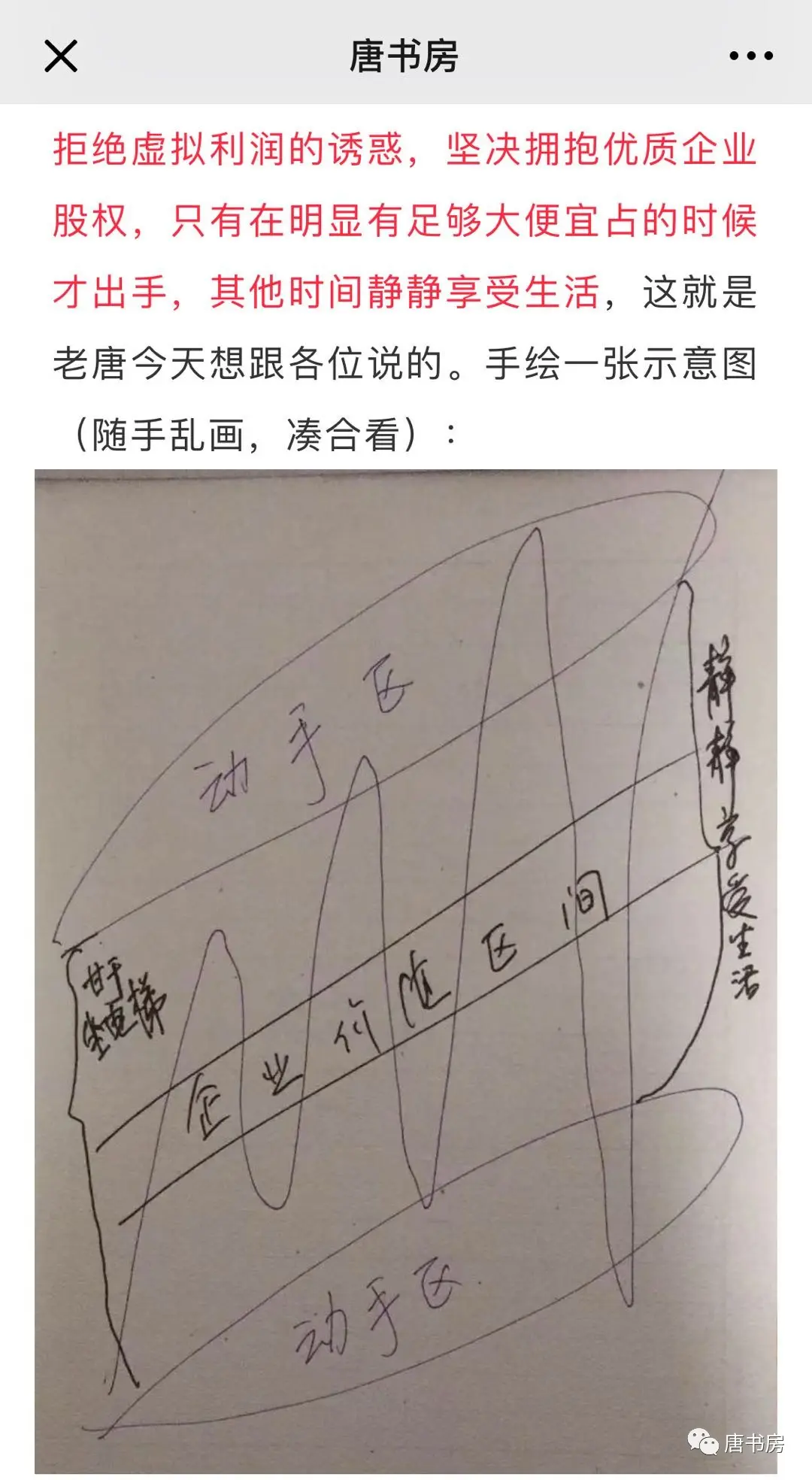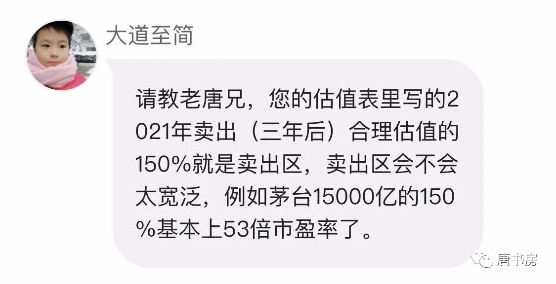 这回答是什么意思呢?很简单,老唐之所以能够获得目前这个自己觉得还算满意的回报,是因为我坚持了一个非常简单的理念,那就是我按照我对企业三年后的估值对折买入,不考虑其他因素。