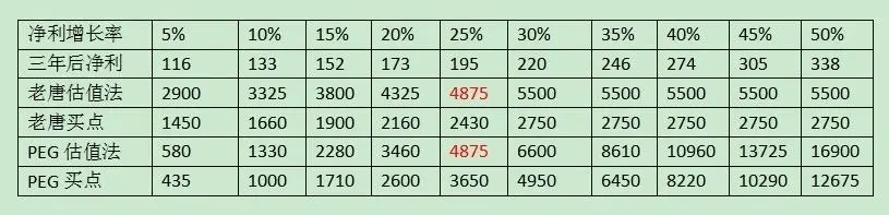 备注:老唐估值法一行的估值,代表三年后的合理估值;PEG估值法的“未来三到五年净利润预计增长率”,也取值三年。