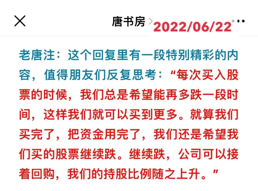 投资理念核心专辑75 2022年书房原创113老唐注:6月29日下午18:43分,书房的@花舞蝶牌在老唐一个帖子下留言,表达了一个观点,说“巴菲特一贯说盼望股价下跌,是因为没有买满仓位。如果买满了,还是会希望涨的,早涨早好”。这个观点很有意思,可能代表了大多数朋友的看法,于是我当时给花舞蝶牌回复了一个长帖,这引发了很多朋友参与讨论,接着我又补充了两条长帖。