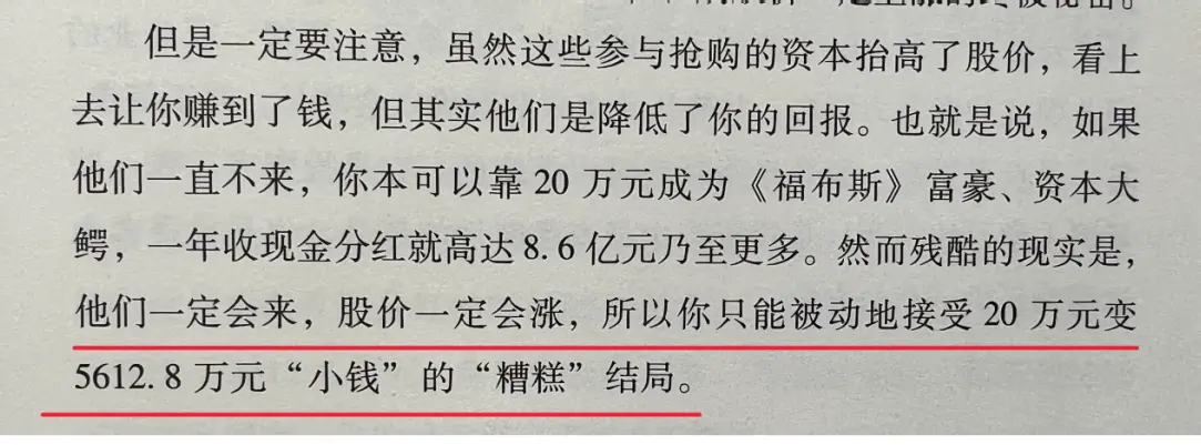 「如果他们一直不来, 你本可以靠 20 万元成为 《福布斯》 富豪、 资本大鳄, 一年收现金分红就高达8.6亿元乃至更多。然而残酷的现实是, 他们一定会来, 股价一定会涨, 所以你只能被动地接受20万元变5612.8万元“小钱”的“糟糕”结局」因此,彻底弄懂这个理念的价值,不在于盼跌盼涨的价值,而在于你会彻底放心。