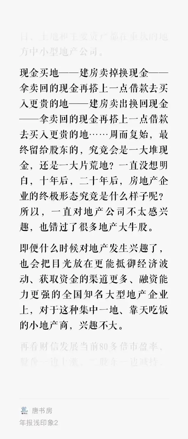 唐朝:2017年,地产股鸡犬升天的时候,老唐壮起鼠胆写下的这段话(2017年1月24日《年报浅印象2》),现在终于可以彻头彻尾地拿出来嘚瑟了。