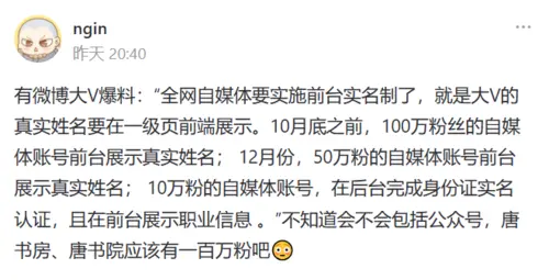 现在传的新规则,是专门针对有一定影响力的所谓大V,要求前台显示实名及职业信息。