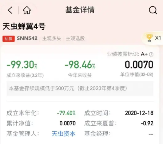 虽然该产品基金经理并未公开,不过截至2月2日,天虫资本总经理陈贤其管理的产品,今年以来亏损也达到了88.58%。记者同时注意到,天虫资本旗下还有多只产品规模不足500万元。”
