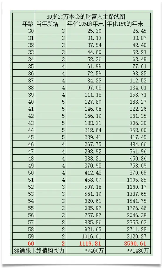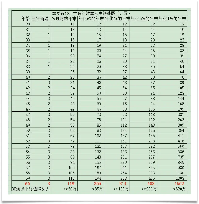 我用我觉着近于所有人都可以做到的数据,模拟了一个表:假设一个30岁的人,手上有10万本金,然后30~40岁之间每年追加投入1万元,40~50岁之间每年追加投入2万元,50~60岁之间每年追加投入3万元。