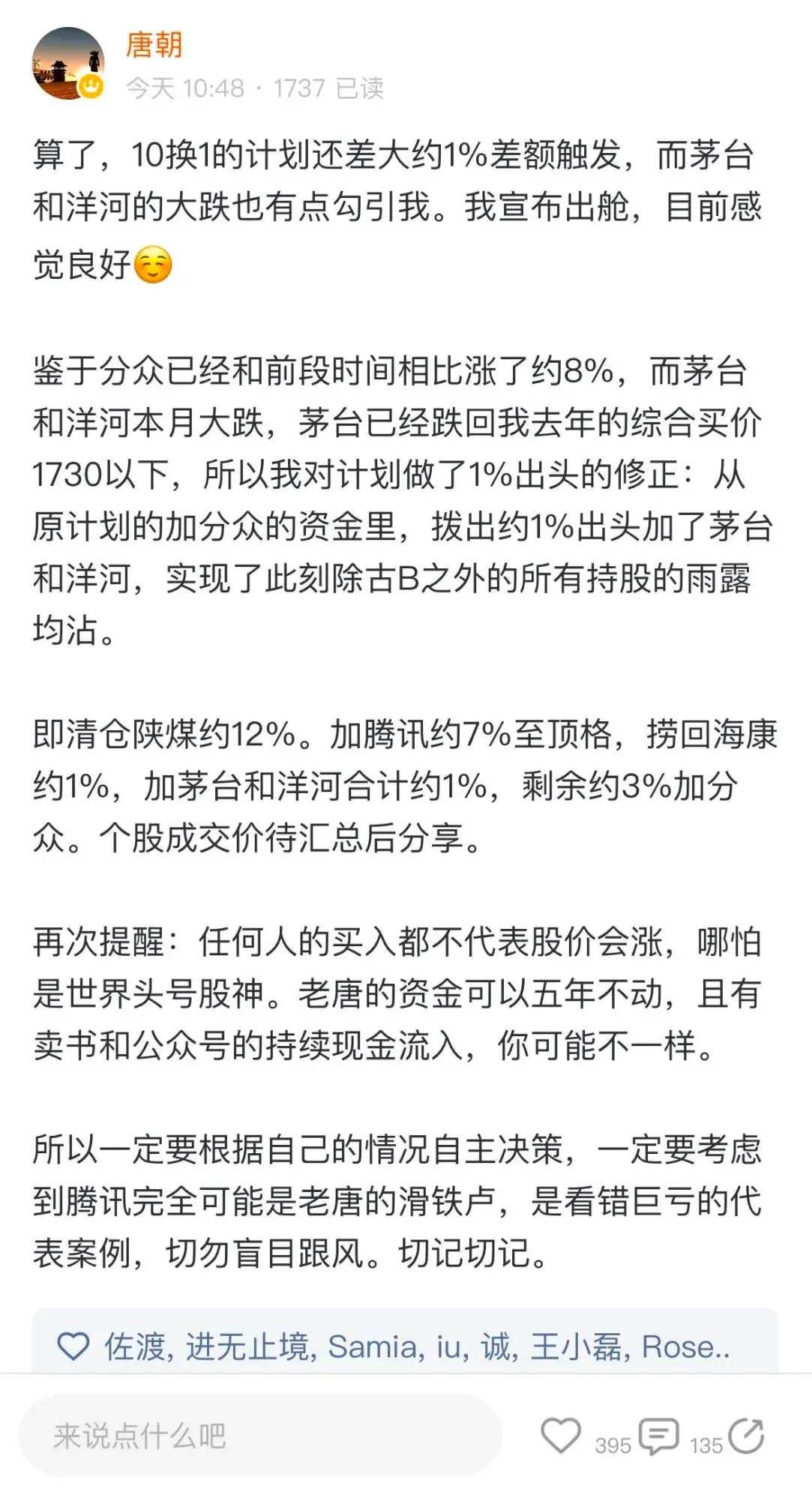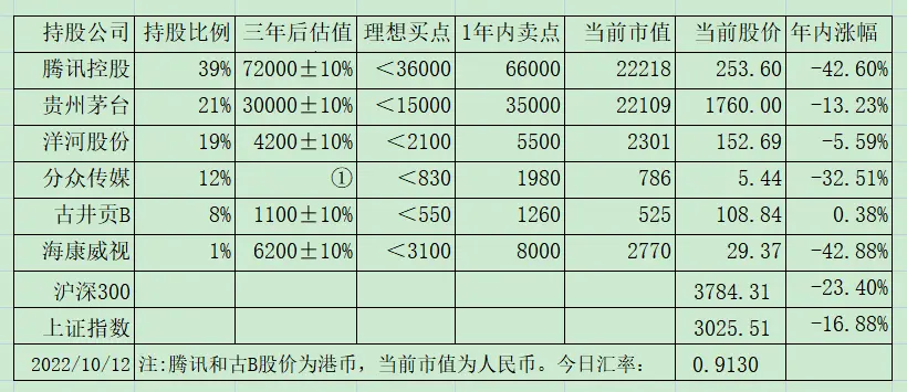 当然,你如果追问我:为啥还差1%你就守不住原则了?我只能无言以对,坦诚自己没扛住诱惑。差劲、差劲、太差劲目前持股:腾讯39%;茅台21%,洋河19%,分众12%,古B8%,海康1%。