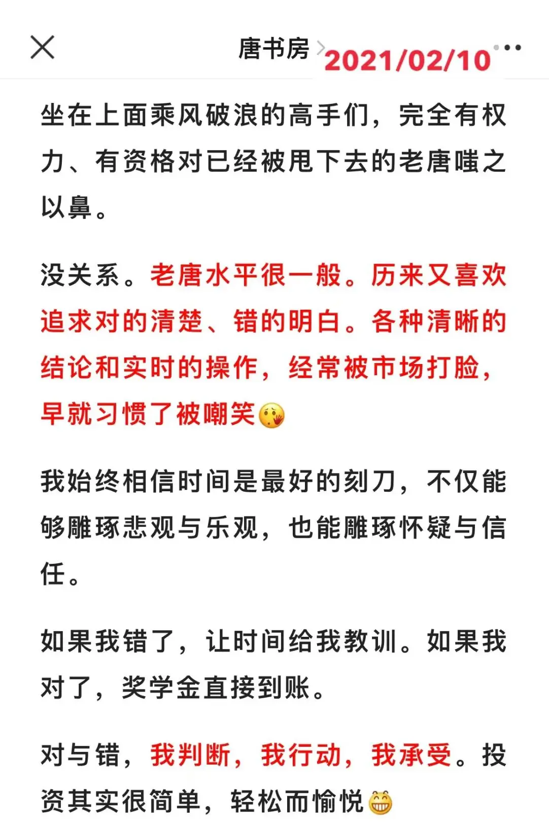 当然,实在理解不了,那就理解不了吧。说老唐嘴硬,或者维持大V人设也都无妨我始终相信时间是最好的刻刀,不仅能够雕琢悲观与乐观,也能雕琢怀疑与信任。