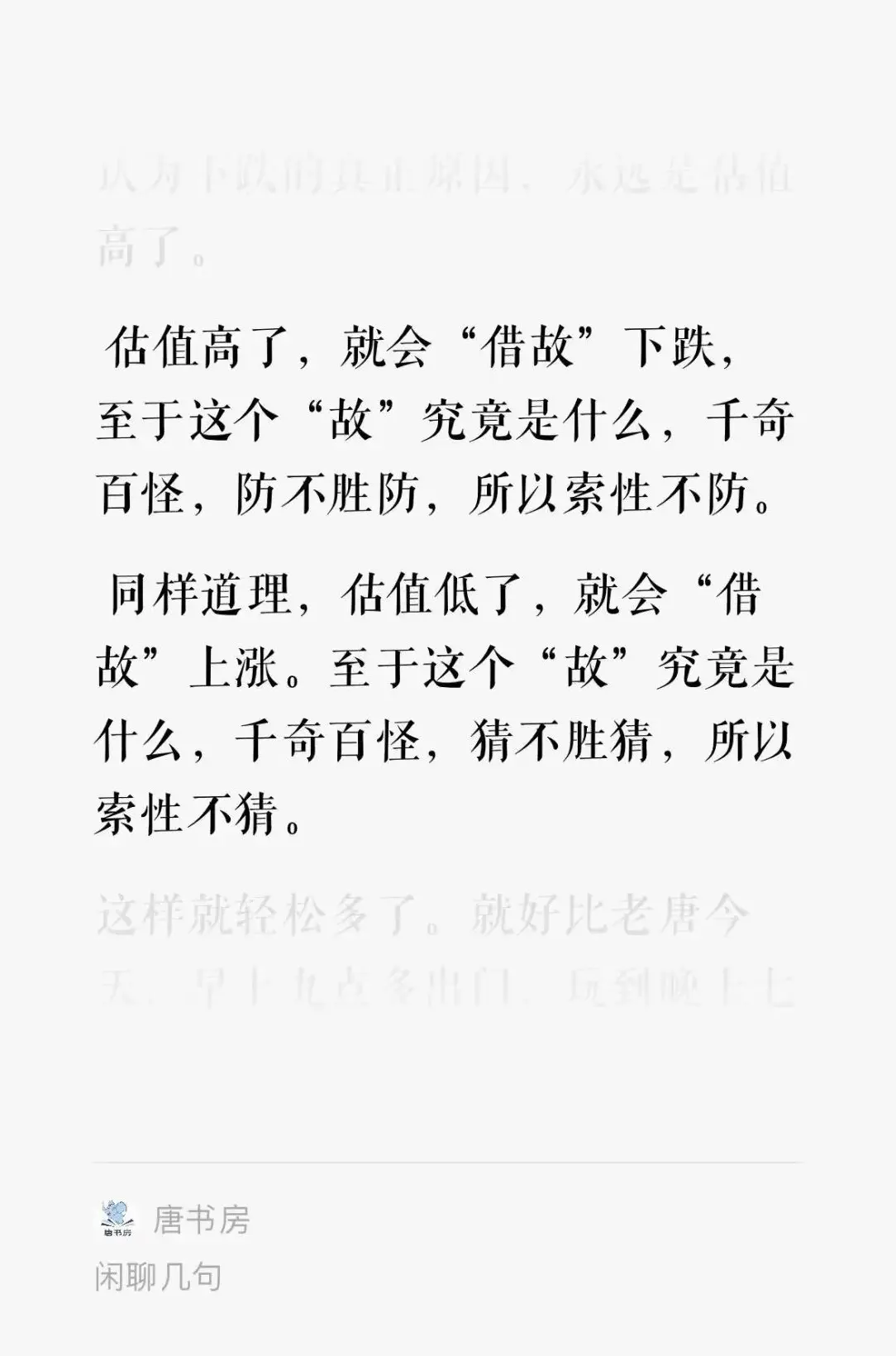 淡蓝:从一个人一辈子都在自己的能力圈内投资,一辈子都是在主动或被动的投资,从来就没有人可以空仓。就很好理解为什么说很多人哪怕是储蓄,也比大部分人强了。因为大部分人要么在股市里面赌博,要么在股市外面赌博。是咯是咯喂:无端端就崩了,20%、30%的崩。这时候没有杠杆,大喊一声刺激啊,然后或许还能搓手手看戏,要是杠杆在身,那就真是刺激了……唐朝:是啊,当时跳楼的人可不少,指的是真的跳楼结束生命,不是形容词。
