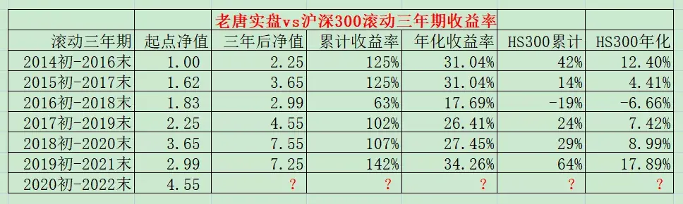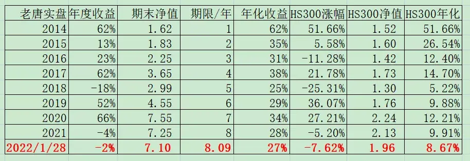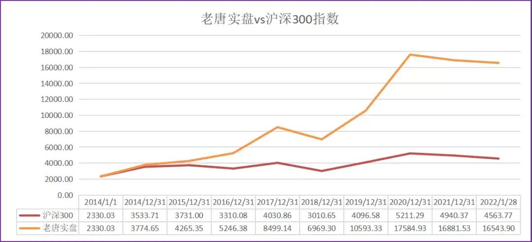 注①:老唐实盘年度收益率,按基金净值法和实际收益率孰低取值,均不含新股收益。注②:沪深300指数收益未包含每年2%左右的分红,年化收益数据略有低估。