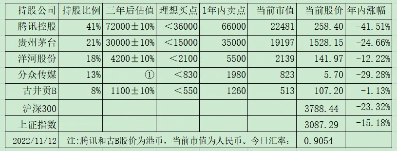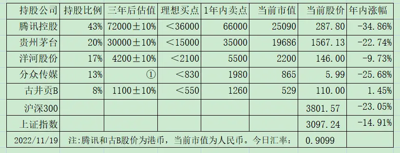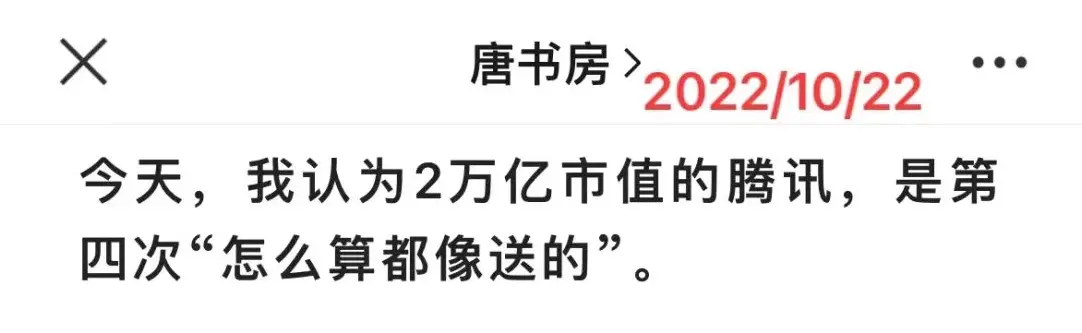 按照公司管理层在电话会议上透露的信息,内部收益率(IRR)达到了年化30%——分批投资,资金占用时间不同,不能直接用1700/310然后开8次方计算,采信管理层披露数据即可。IRR收益率大致就相当于我们说的资金加权收益率,即考虑了新增资金不同占用时间的实际收益率。在A4、疫情和中概美国退市的三重压力下,美团股价从去年2月460港币高点已经跌去65%的情况下,该笔投资还能有30%的年化收益。可想而知,460的时候,圈内看决策者一定是仰慕的满眼冒星星关于估值,大致就是上周预告的下调幅度。我放在下周周记里详谈数据和思考过程吧。不过,这不改变当下腾讯依然位于买点之下的观点,毕竟今天市值也才2.5万亿。