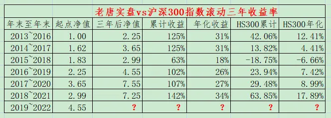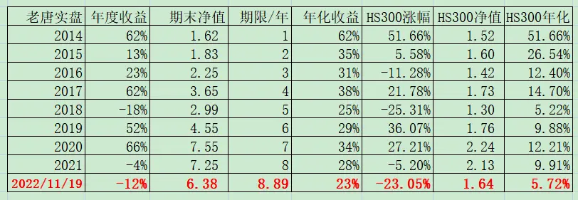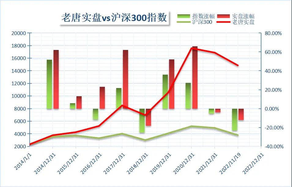 注①:老唐实盘年度收益率,按基金净值法收益率和资金加权收益率孰低取值,均不含新股收益。注②:沪深300指数收益未包含成分股现金分红,年化收益率数据略有低估。