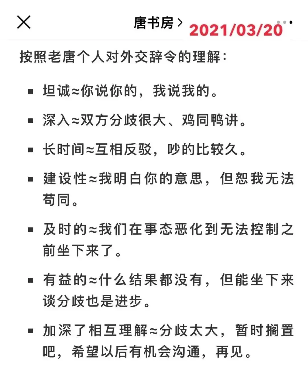 这次见面主要成果大致可以说是缓和了冲突,划清了底线(主要是俄乌底线和台海的底线)。我方明确表态反对使用核武,美方表态不寻求改变台海现状。这大幅降低了俄乌和台海局面恶化的可能,是了不起的成绩。